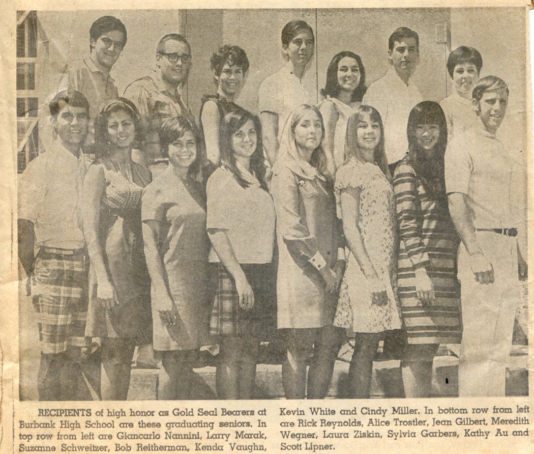 This picture was taken so long ago that at the moment I don’t remember whether it was taken before or after graduation. According to the commencement ceremony program, Sealbearers are students who “maintained membership in California Scholarship Federation for four or more semesters including one in the senior year achieving at least three A’s and one B each semester. CSF is nationally recognized.”