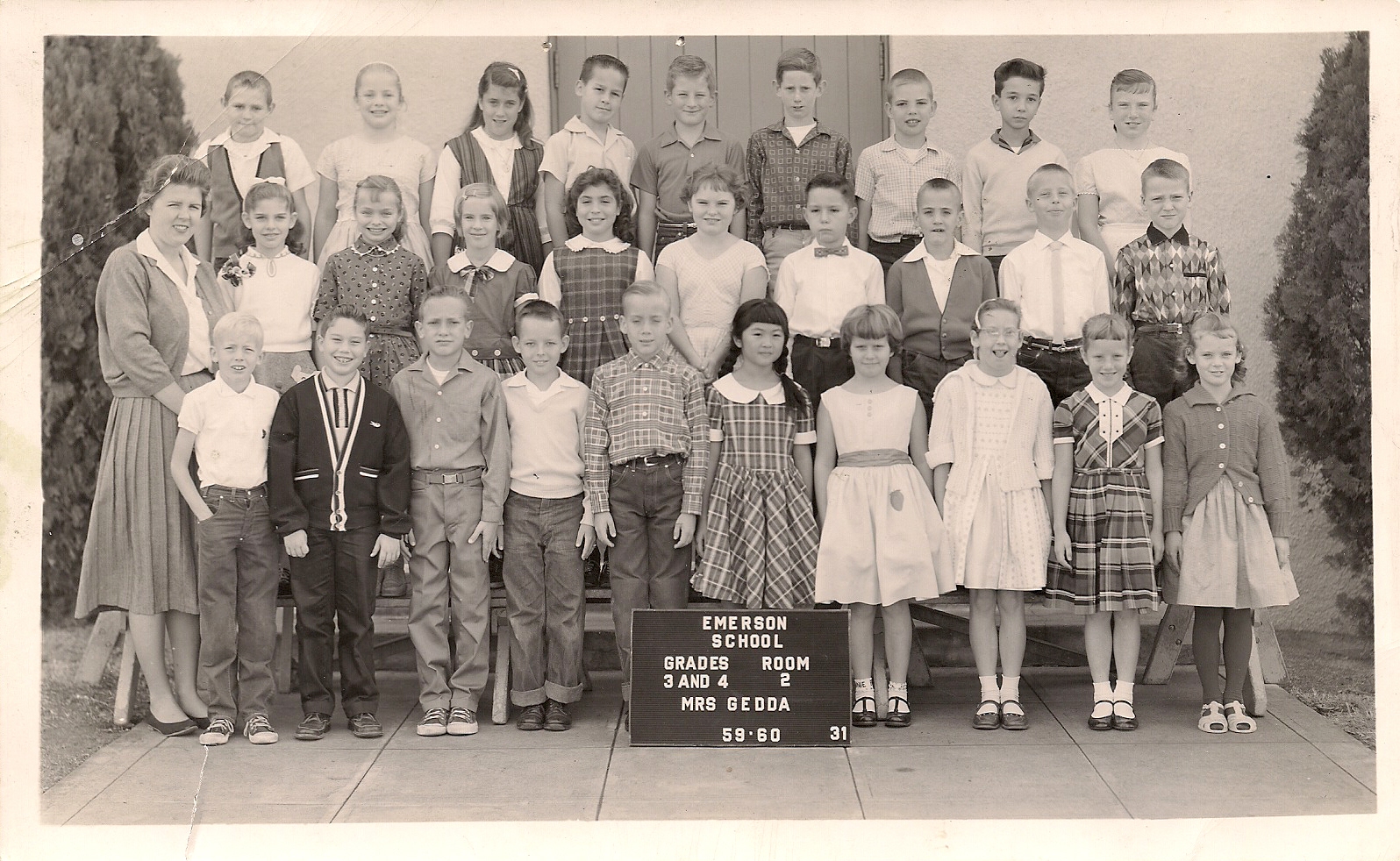 Jill Gipson, as some of you may recall, is one of our X-graduates, that is, she went to elementary school with us, then moved away before high school. She was the one who answered my call about having old pictures and sent these this photo of Emerson School’s fourth grade class, where many of our Burbank High Class of 1968 attended. She even had the names of the kids written on the back! If you like, you can go back and read my post about her.