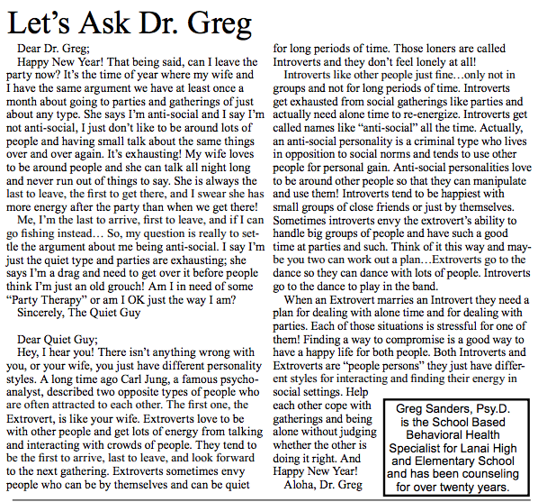 In fact, Dr. Greg writes a monthly advice column for the local newspaper, “Ask Dr. Greg” and Jim brought me a copy. I was happy to see that the free newspaper, Lanai Today, is available online, so you can easily find the latest article from January 2015 which I am posting here.