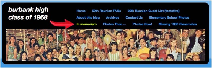 Wow! This means that for a 50 year reunion, about 20% of our classmates should have died. But in fact, if you count up the number of our memorialized classmates, nearly 70 people in our class are on that list. That means that our class is below the average since we had about 640+ graduates. If you haven’t gone there already, our class website, www.burbankhigh1968.net has a list of classmates who are gone forever but not forgotten: In memoriam