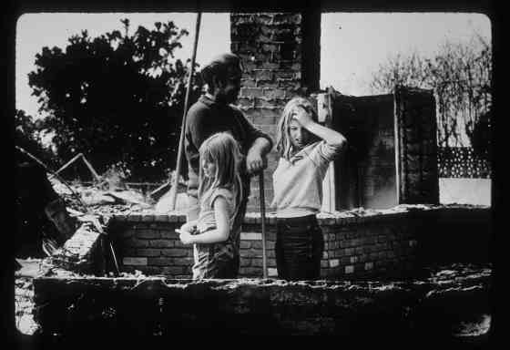 Aftermath of a brush fire in Glendora Bob shot on his day off. Family had lost their home and returned to survey the damage. He gave the father a couple of airline bottles of scotch from his trunk to soothe his evening. (Photo by Bob Chamberlin)